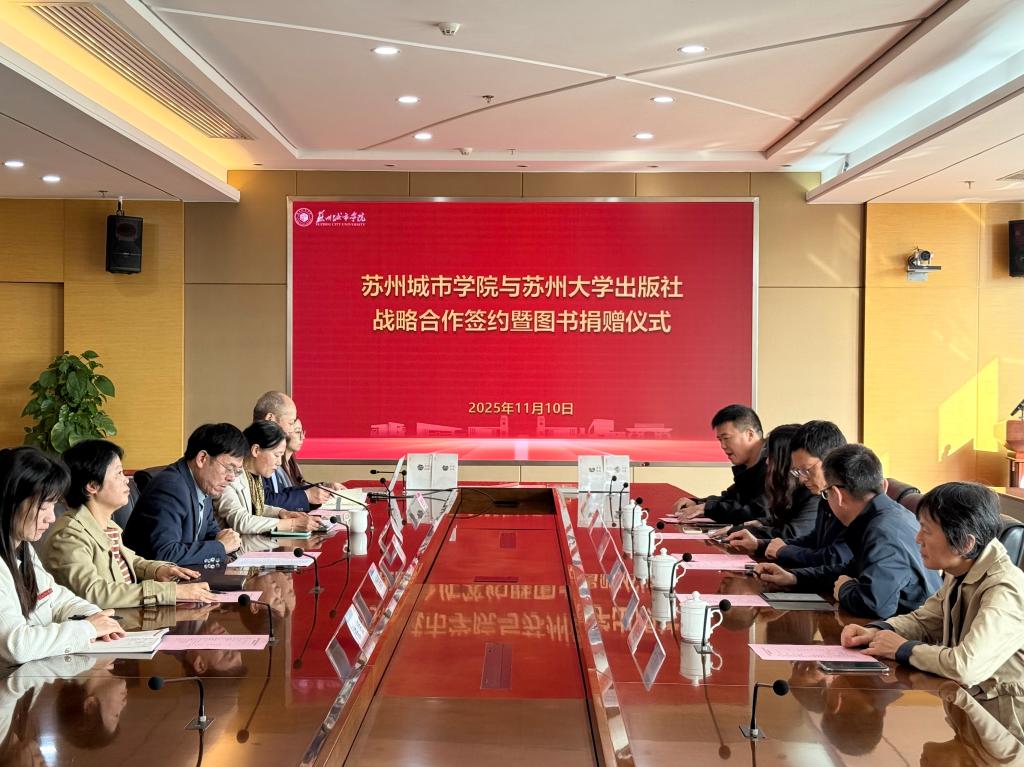 2025年11月10日,“书香致远,聚力同行——苏州城市学院与苏州大学出版社战略合作暨图书捐赠仪式”在苏州城市学院综合楼隆重举行。双方将通过深度合作,共同推进学术出版、人才培养和文化传承,为苏州文化教育事业高质量发展注入新动能。