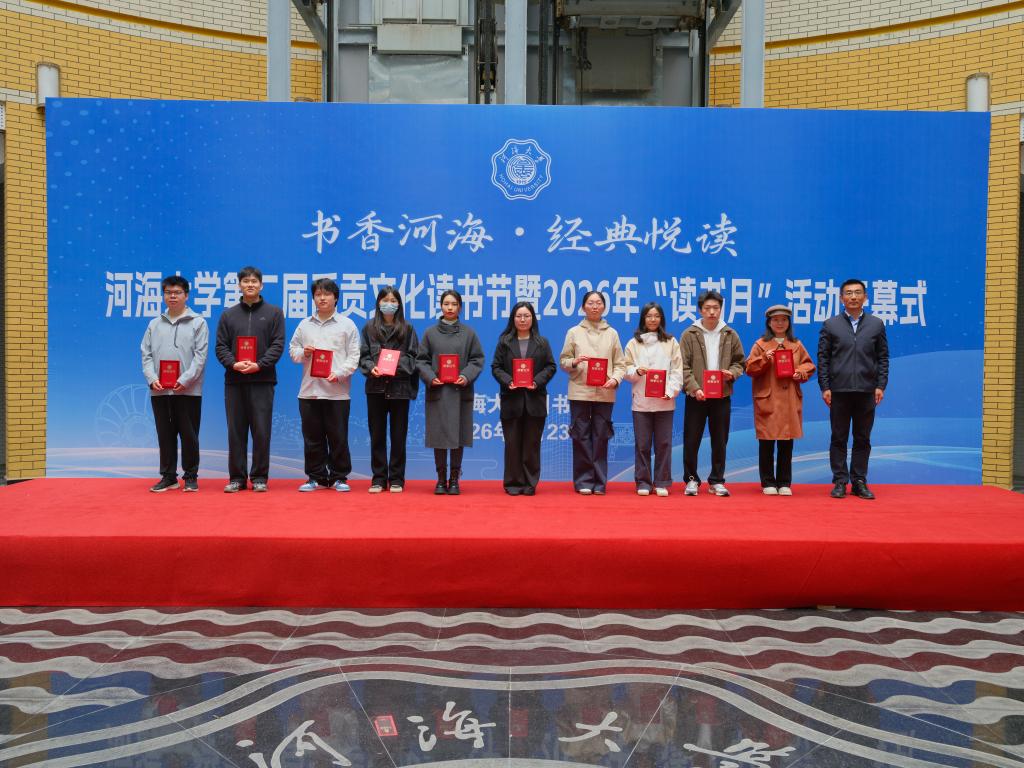 宋翔洲副校长宣布河海大学第二届禹贡文化读书节暨2026年“读书月”开幕,并与党委宣传部魏有兴部长、校工会浦玲主席、后勤处秦光宇处长、校团委朱乔书记、教务处王玲副处长一起为“教职工十佳书评”获奖者和河海大学2025年“读书之星”以及“荐购之星”“借阅之星”颁奖。活动由图书馆、档案馆、期刊部党总支书记王志峰主持。(河海大学图书馆供稿)