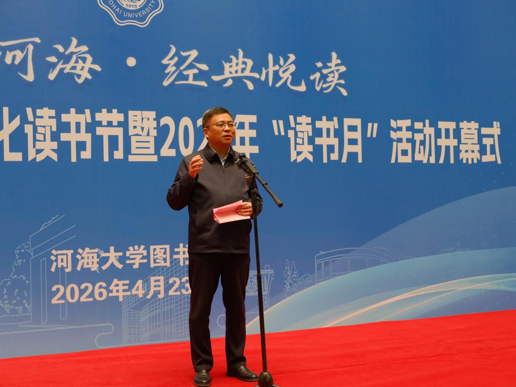 在首个全国“全民阅读活动周”来临之际,4月23日中午,河海大学第二届禹贡文化读书节暨2026年“读书月”活动开幕式在江宁校区图书馆一楼水波纹大厅举行。活动以“书香河海•经典悦读”为主题。宋翔洲副校长、学校校园全民阅读活动工作组成员、学院(系)及相关职能部门领导、图书馆馆员及师生代表280人出席开幕式。